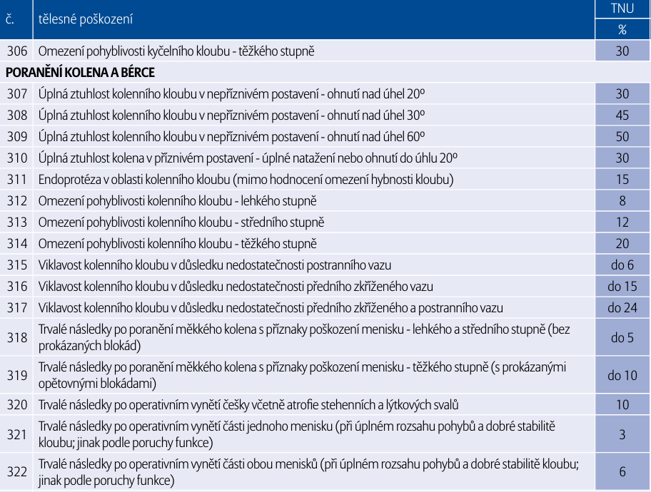 Pojistit si můžete jak “velké” trvalé následky (od 10 % tělesného poškození), tak i ty “menší” následky (od 0,01 % tělesného poškození) – ty jsou v rámci běžných úrazů rozhodně praktičtější. Pojištění se sjednává s určitou pojistnou částkou, standardně kolem 1 milionu korun. Konkrétní plnění v případě trvalého následku závisí na jeho procentuálním ohodnocení v oceňovacích tabulkách pojišťovny. Ukážeme vám to na příkladu trvalých následků po úrazu kolene níže.